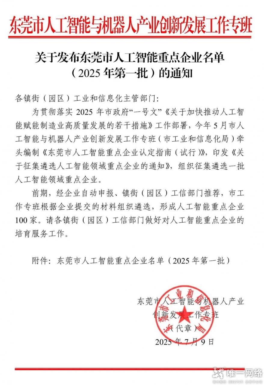 近日,東莞市人工智能與機(jī)器人產(chǎn)業(yè)創(chuàng)新發(fā)展工作專班正式發(fā)布《東莞市人工智能重點(diǎn)企業(yè)名單(2025 年第一批)》,唯一網(wǎng)絡(luò)憑借在人工智能領(lǐng)域的戰(zhàn)略布局、技術(shù)積淀與產(chǎn)